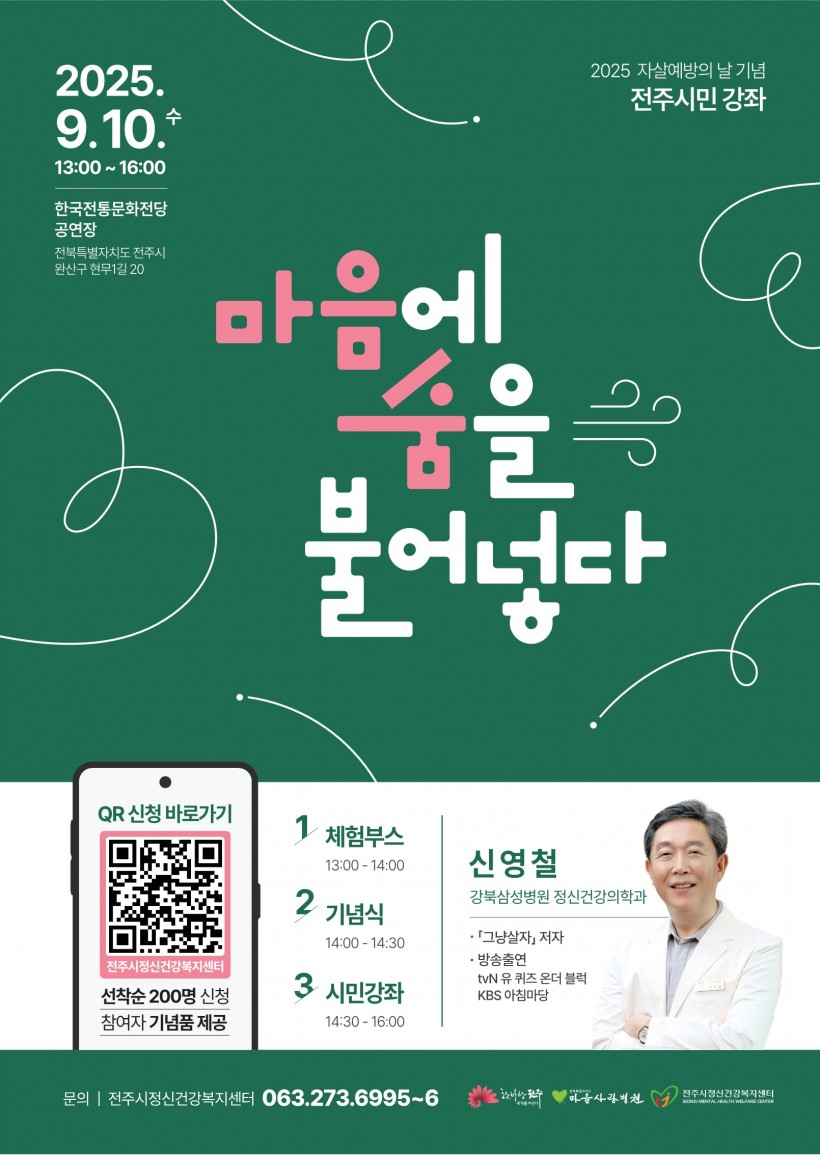 25년 9월 자살예방의 날 행사를 진행합니다. 페이지 정보 작성자 이종범 작성일25-07-24 09:06 조회193회 댓글0건 다음글 수정 삭제 목록 글쓰기 본문 전주시에서 자살예방의 날을 맞아 행사를 진행하오니 많은 참여 바랍니다. 댓글목록 등록된 댓글이 없습니다. 다음글 수정 삭제 목록 글쓰기